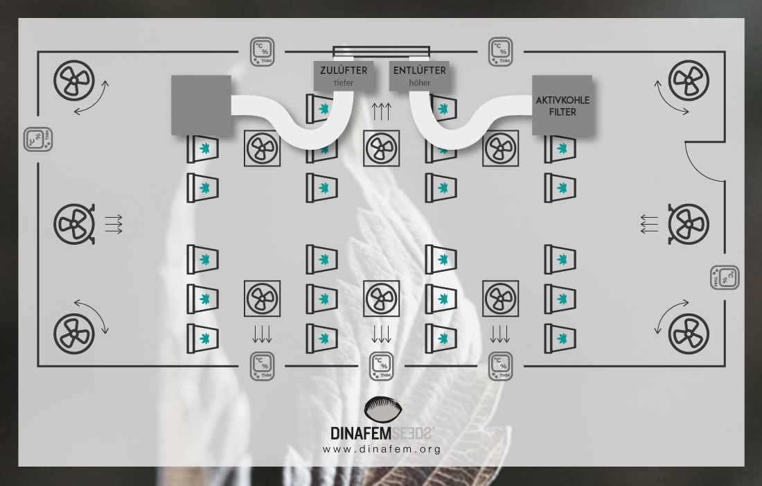 Wir empfehlen euch deshalb, euch die Verteilung der verschiedenen Klimaregler-Geräte im Grow-Raum des Schemas oben genau anzusehen. So werdet ihr die jeweilige Rolle der Apparate besser nachvollziehen und in Zukunft darauf achten können, sie an strategischen Punkten im Raum anzubringen. Wenn ihr eine ähnlich dimensionierte Kultur anstrebt, habt ihr hier also zumindest in klimatischer Hinsicht den Schlüssel zum Erfolg!