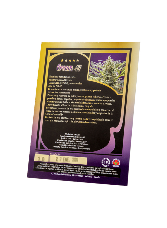 Bei den Cream 47 Hanfsamen von Sweet Seeds handelt es sich um eine feminisierte Cannabissorte, die aus der Kreuzung einer Cream Caramel mit einem AK-47-Eliteklon hervorgegangen ist. Das Ergebnis? Eine hochpotente, -produktive und -aromatische Pflanze!