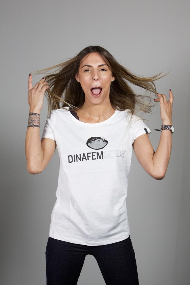 Das T-Shirt hat ein modernes Design, ist tailliert geschnitten und auf der Vorderseite in Brusthöhe mit dem Logo der Dinafem Seeds-Samenbank bedruckt. Der charakteristische Dinafem Seeds-Samen findet sich auch auf einem kleinen Schildchen am linken Ärmel wieder.