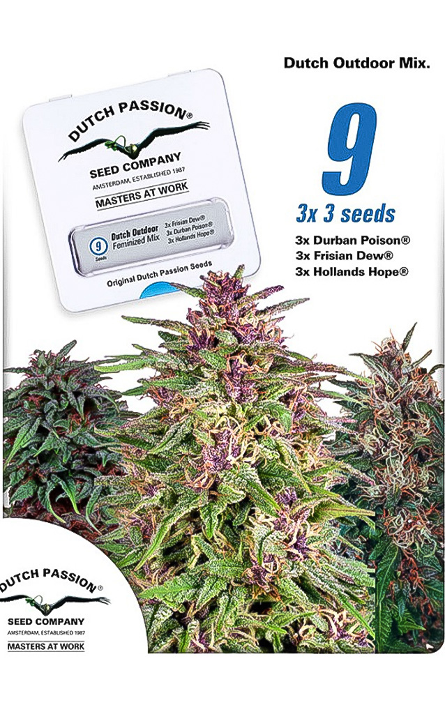 Der Dutch Outdoor Mix von Dutch Passion ist eine Packung mit 9 feminisierten Hanfsamen von 3 verschiedenen Sorten.