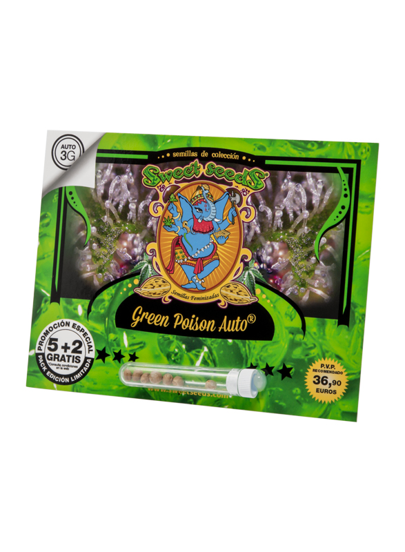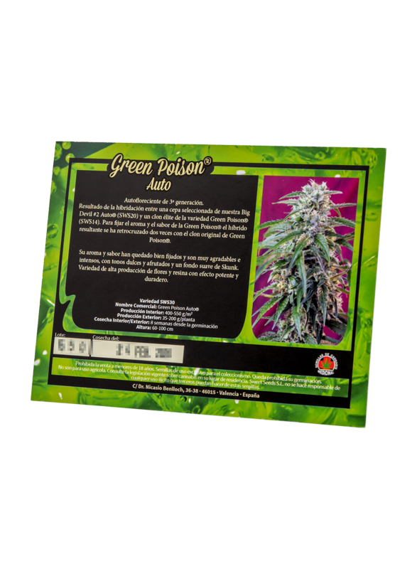 Bei den Green Poison Auto Hanfsamen von Sweet Seeds handelt es sich, wie der Name sagt, um die Autoflowering-Version von Green Poison. Entstanden sind sie durch Kreuzung eines ausgesuchten Big Devil #2-Stamms und eines Green Poison-Eliteklons.