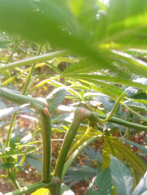 Next we started alternating between irrigation using fertilisers and irrigation using only pH adjusted water. By July the plants had reached 1 metre in height. We used the super cropping technique very carefully, which consists of partially fracturing the branches, thereby making them stronger, so they can then withstand the buds' weight more easily. This also promotes productivity and controls vertical growth, which helps the plants blend in with the rest of the vegetation so they go unnoticed.