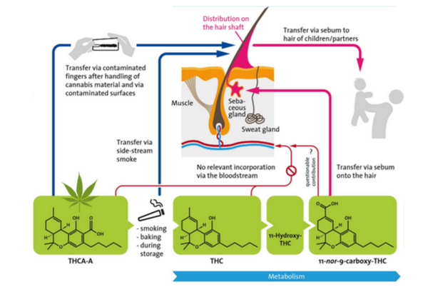 Cannabinoids can transfer over from regular consumers, through their hands, sweat or the smoke itself. In fact, many of them are not usually found in large quantities in the hair following consumption. On the contrary, there may be traces on the oldest parts of somebody’s hair, that is to say, on hairs that grew before consumption and should therefore not be affected by it.