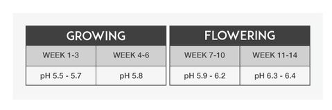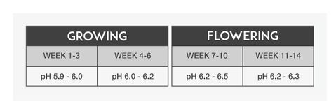 Below you will find the standard recommended pH values for the growing and the flowering period in soil: