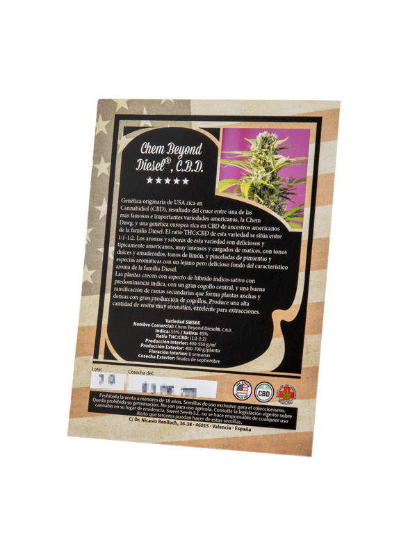 Chem Beyond Diesel CBD cannabis seeds by Sweet Seeds have been created through a really special cross: Chem Dawg, a classic American genetics, meets a CBD-rich strain of the Diesel clan. This gave way to a delicious, high-yielding marijuana strain that is just perfect for elaborating extracts for therapeutic purposes thanks to her impressively high resin production.
