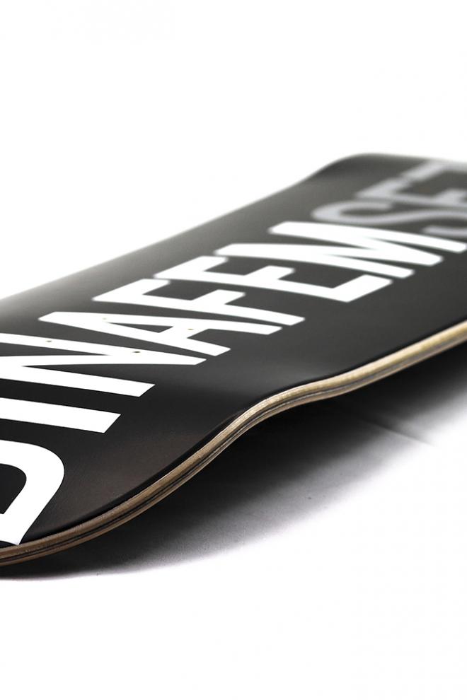 Dinafem skateboard is decorated with a black motif with the name of the seed bank in huge white and silver letters.