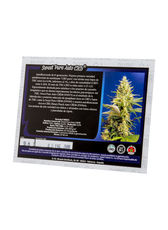 Sweet Pure Auto CBD feminised autoflowering cannabis seeds by Sweet Seeds were obtained by crossing Sweet Pure CBD and Honey Peach Auto CBD. The resulting autoflowering cannabis strain contains virtually no THC – less than 1% – and is rich in CBD (8-20%). As a result, she is almost non-psychoactive and provides numerous health benefits. Read more >