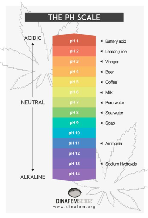 El pH se mide en una escala de 14 puntos de medida. Se considera que el pH es ácido si está situado entre 0 y 7, neutro si el valor es 7, y alcalino si se encuentra entre 7 y 14. El pH varia en función del sustrato utilizado, y es más sencillo controlarlo en un cultivo con tierra (sustrato tampón) que en un cultivo hidropónico (medio de cultivo más inestable que la tierra en el cual los elementos minerales interactuan de forma mucho más rápida).