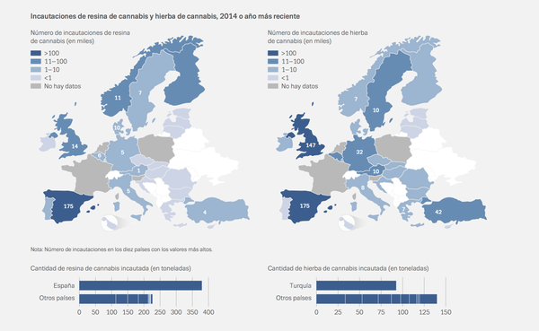 Finalmente, las incautaciones de cannabis siguen aumentando año tras año; durante 2014 alcanzaron las 682.000 en toda la Unión. La mayoría de las de hierba y resina se produjeron en España. Sin embargo, las conclusiones económicas ponen de manifiesto que las políticas penalizadoras y restrictivas no ofrecen a los Gobiernos los resultados que esperan, así como la necesidad de que empiecen a plantearse medidas desreguladoras en el marco europeo.