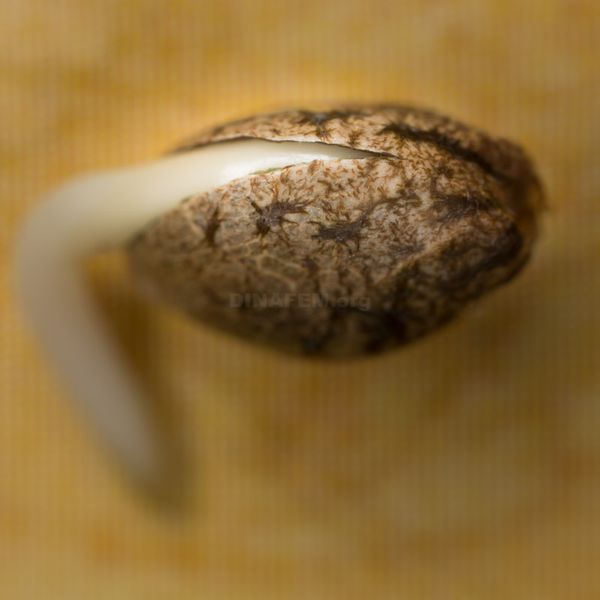 - Inserta la semilla en el agujero central del Jiffy, no demasiado profundo (a unos 5 mm aproximadamente) con la punta hacia arriba. La planta de la marihuana no debe sembrarse a mucha profundidad porque sino la raíz debe hacer demasiado recorrido: siempre sale por la parte puntiaguda de la semilla, hace un giro de 180º, penetra en la tierra y una vez que se ha anclado, levanta la "cabeza" de donde saldrán los cotiledones.