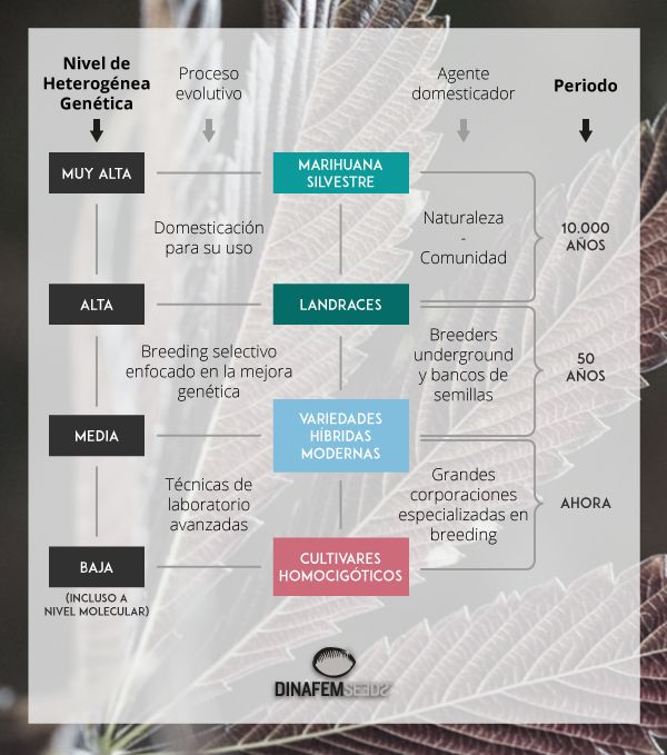- Después de explicarte los fundamentos básicos en el primer capítulo de la serie “Dinafem genética cannábica”, hoy te explicaremos un poco más sobre el origen de las variedades de marihuana que conocemos hoy en día. Antes de que el proceso de breeding avanzado diera lugar a los cientos de híbridos que hoy conforman el amplio árbol genealógico del cannabis, antes de las versiones XXL, las autoflorecientes o las CBD, mucho antes de todo esto ya existían las landraces: las genéticas que han sido el origen de todas las variedades de cannabis que conocemos en la actualidad.