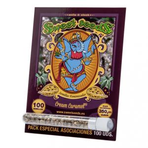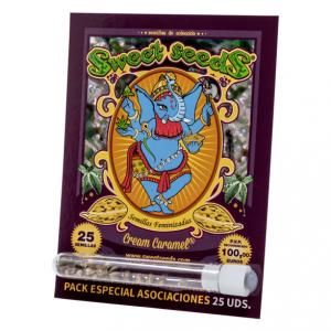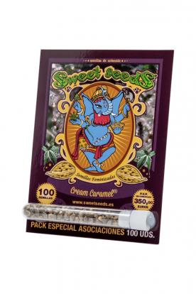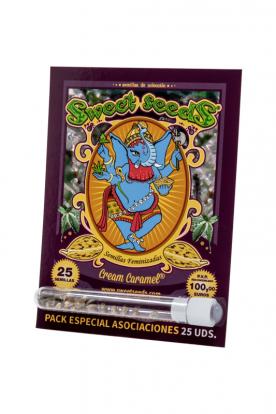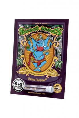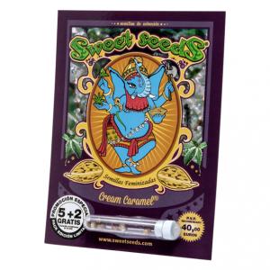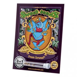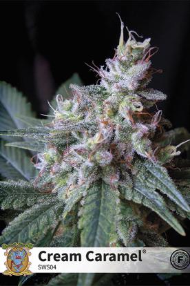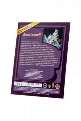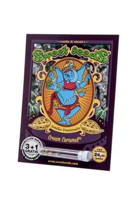 Las semillas de marihuana feminizadas Cream Caramel de Sweet Seeds son resultado del cruce de varias de las mejores Indica del banco: Blue Black x Maple y Leaf Indica x White Rhino.