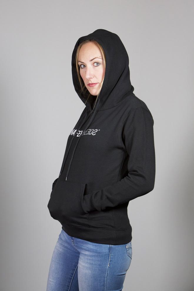 Sudadera Chica Dinafem  de color negro. Se trata de un modelo con un corte cómodo y actual, diseñado especialmente para chica. Está fabricada en tejido 100% algodón de alta calidad. Disponible en tallas S, M, L. Leer más >