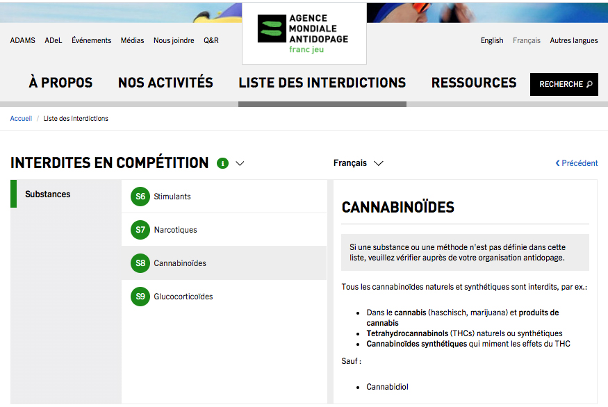 - Le cannabidiol a été retiré de la liste des substances interdites pare l'Agence mondiale antidopage (AMA) en 2018.