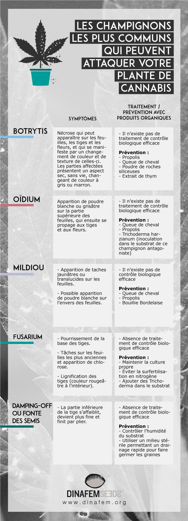 - L’humidité et autres facteurs environnementaux peuvent favoriser l’apparition de champignons dans votre culture de cannabis, une désagréable visite qui se présente sans prévenir.