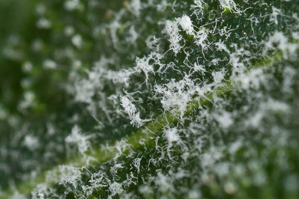 - De petites tâches de poussière blanche translucide apparaissent (ressemblant à des traces de farine) sur la partie supérieure des feuilles, habituellement sur les parties inférieures des plantes.