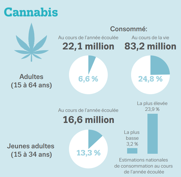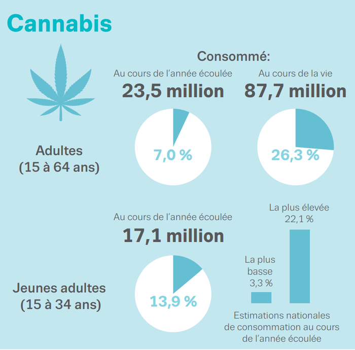 - Cela représente donc une augmentation de 1,4 millions de personnes en comparaison avec 2016, alors que la consommation de cannabis avait atteint plus de 22,1 millions d’européens.