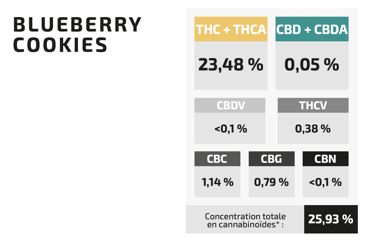 Pour vous expliquer cela, nous avons décidé de l'analyser en profondeur puisque comme nous l'expliquait notre équipe technique « Même si vous savez qu'elle a quelque chose de spécial en la respirant, ce n'est qu'en analysant les terpènes qu'on peut vraiment être sûr de son originalité ». Le profil terpénique obtenu suite à l'analyse du chromatographe en phase gazeuse et les concentrations en cannabinoïdes étaient toujours aussi fidèles aux premiers spécimens examinés. Analysons donc ensemble les caractéristiques des Blueberry Cookies.