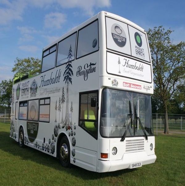 Notre présence sera également visible à l'extérieur grâce à un autobus VIP à deux étages qui servira de support publicitaire pour l'occasion ; et que nous avons décoré avec nos amis d'Humboldt Seed Organization pour sillonner les routes britanniques dans le cadre d'une tournée pour présenter nos deux banques de graines.