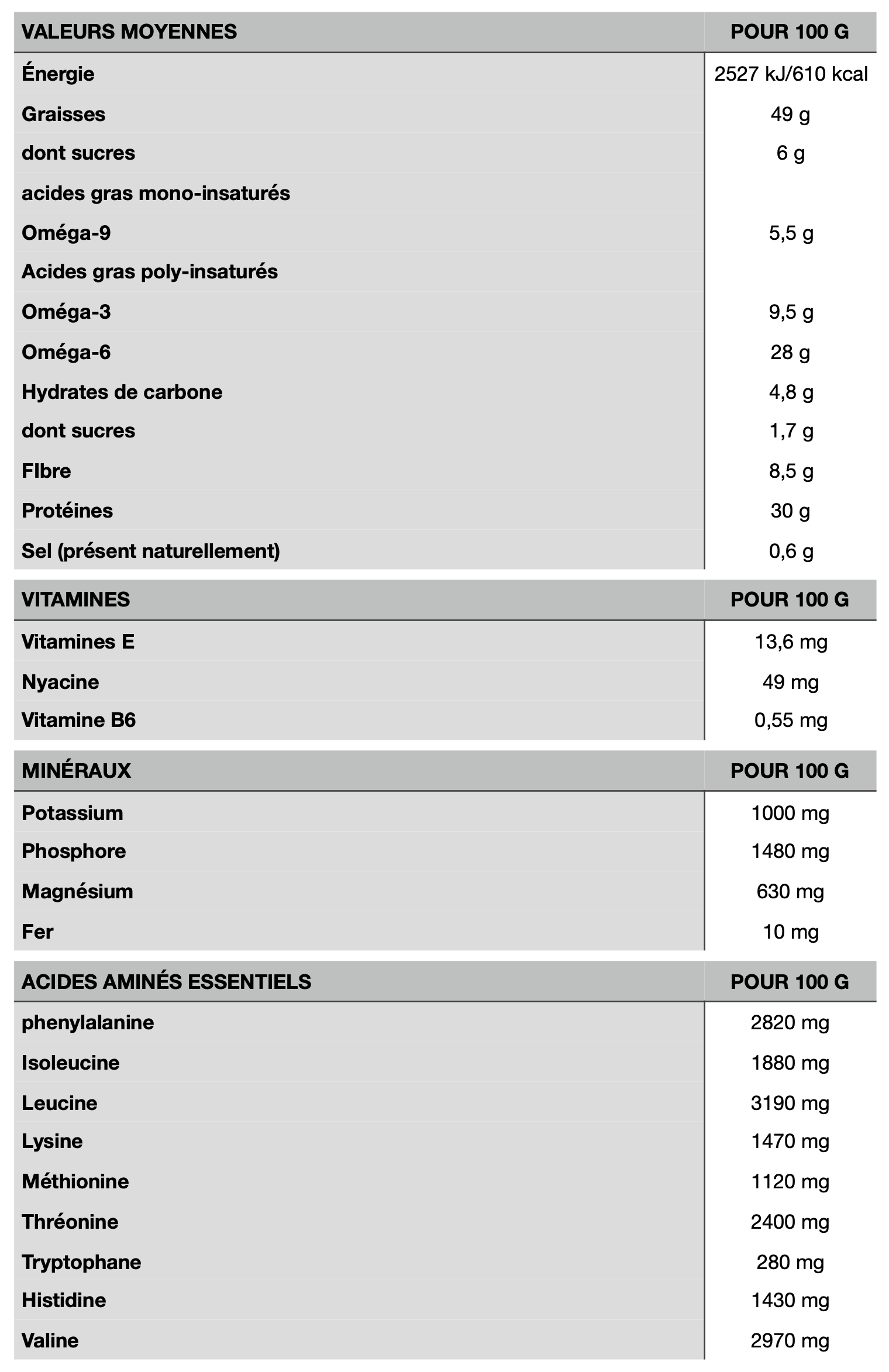 dont sucres : 6 g - oméga-9 : 5,5 g
