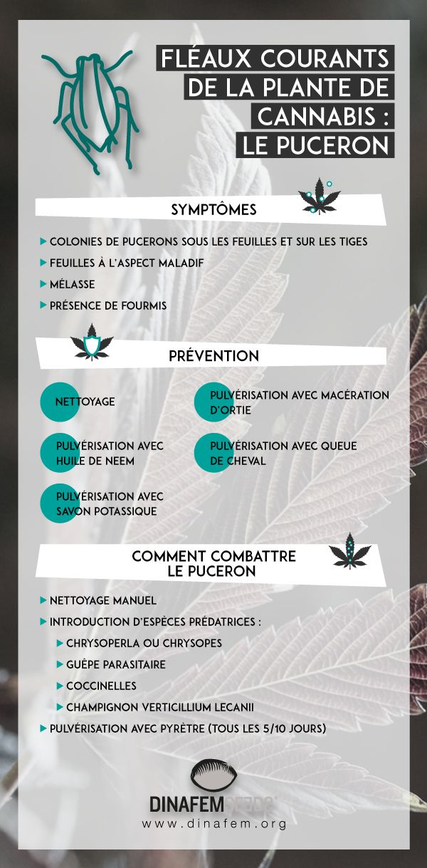 - Ces petits insectes s’alimentent de la sève vitale des plantes et le cannabis est pour eux un mets exquis. Si vous voulez éviter que ces déprédateurs du règne végétal ne ruinent votre récolte, soyez attentif, ci-après nous vous donnons les clés pour prévenir leur apparition, les détecter et les éliminer. Vous êtes prêts?