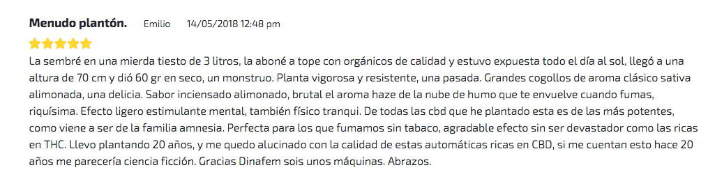 Tous les deux mois, nous réalisons un tirage au sort parmi les commentaires de notre site web, et nous vous offrons un pack Dinafem. L'avis et l'opinion des cultivateurs à propos de nos génétiques sont très importants pour nous, puisque ce sera la seule façon de connaître en personne ce que vous pensez de nos variétés. Mais votre contribution aidera également les personnes qui ne savent pas encore quelle graine acheter, car votre expérience pourrait bien leur être utile. Et maintenant, lorsque vous laissez un commentaire, vous entrez directement dans le tirage au sort du pack Dinafem.