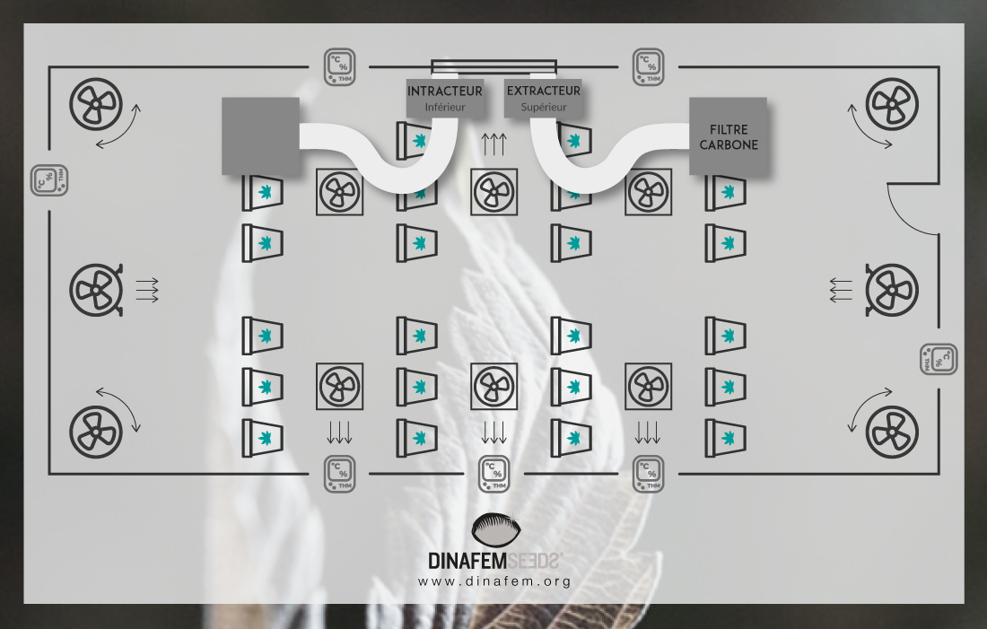 C'est la raison pour laquelle, nous vous conseillons de prêter une certaine attention particulière à la disposition des différents éléments climatiques de cette salle de culture dans le schéma ci-dessus. Cela vous permettra de finalement bien comprendre, le rôle fondamental joué par l'ensemble de ces derniers et surtout de veiller à la bonne répartition de ceux-ci à certains endroits stratégiques de la salle de culture. Si vous entreprenez une culture dans une dimension similaire, vous avez là la "clé de la réussite" en ce qui concerne l'aspect climatique en tous les cas.