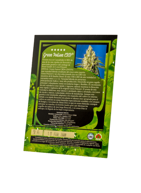 Les graines de cannabis Green Poison CBD de Sweet Seeds ont été créées suite au croisement entre une Green Poison et un clone sélectionné riche en CBD. Nous sommes face à un hybride productif et rapide qui surprendra agréablement par des récoltes idéales pour un usage thérapeutique et peuvent être cultivées sans avoir besoin d'expérience en la matière. Tout une réussite pour cette banque de graines, qui mérite bien une ovation.