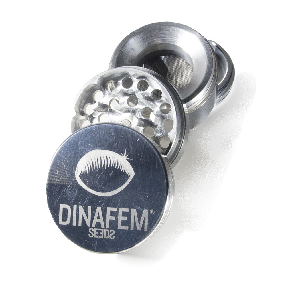 Le grinder Dinafem comprend un compartiment pour récupérer le pollen, une grille et un couvercle avec le logo de la banque de graines Dinafem Seeds. Un aimant aide à bien fixer le couvercle et facilite sa fermeture et son ouverture.