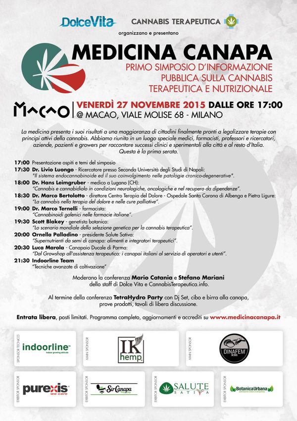 - Il 27 Novembre a Milano il centro per le arti Macao ospiterà il primo simposio d’informazione pubblica sugli usi medici e nutrizionali della cannabis. “Medicina Canapa” è il nome dell’evento, centrato sul dialogo tra diverse personalità che operano nel mondo della cannabis terapeutica ed industriale.