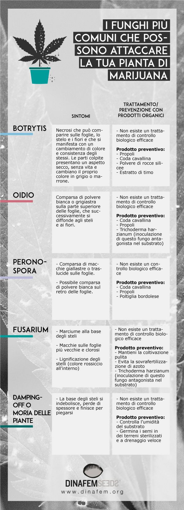 Anche se esistono prodotti chimici per fumigare le piante di marijuana in modo preventivo, ne sconsigliamo l'uso per vari motivi: per iniziare, la fumigazione non ti assicura al 100% che in seguito non compaia questo fungo e, soprattutto, questi prodotti lasciano delle tracce di residui chimici che possono essere pericolose per la salute. Ricorda che tutto ciò che utilizzi con le tue piante di marijuana andrà a finire nel tuo organismo quando le consumerai. Pertanto, la cosa più indicata è quella di evitare le condizioni adatte alla loro comparsa controllando sempre l'umidità, l'igiene e la densità della tua coltivazione. Noi ti consigliamo di intensificare le suddette misure e, magari, di provare con qualche antifungino ecologico, come ad esempio la propoli o la coda cavallina in modo preventivo.