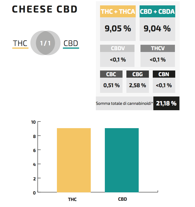 Infatti non dipende tanto da quale percentuale di THC sia presente, ma da qual è il rapporto THC/CBD. In altre parole, qual è la proporzione relativa di concentrazione tra i due. Prendiamo ad esempio Cheese CBD. Come si può vedere dal grafico a barre dei cannabinoidi, i livelli di THC e CBD sono simili, quindi il rapporto è di 1/1. Ricordando che il cannabidiolo è antagonista del THC, ciò che accadrà nel caso di questa varietà è che il CBD andrà ad annullare la psicoattività del precedente.