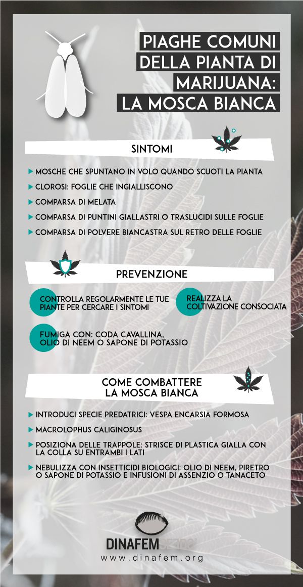 - La mosca bianca (Trialeurodes vaporariorum) della famiglia delle Aleyrodidae è una delle piaghe più comuni nella coltivazione della marijuana e, pur non essendo la più letale, non devi sottovalutarne la capacità di rovinare o quantomeno compromettere sostanzialmente il tuo raccolto.
