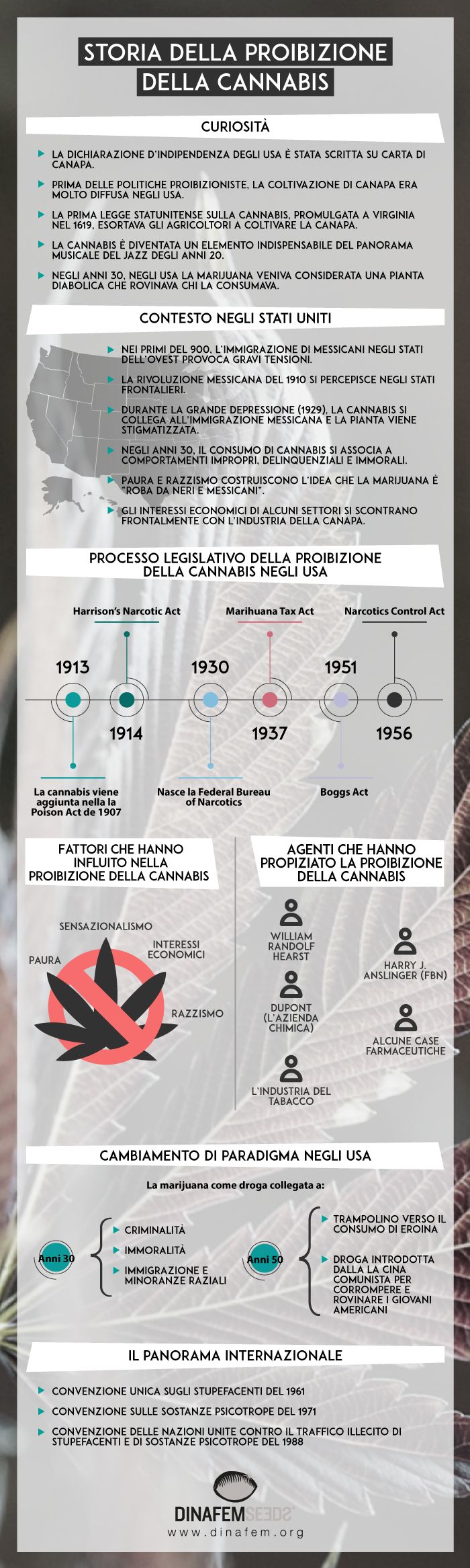 Gli Stati Uniti svolsero un ruolo fondamentale nella proibizione della cannabis a livello mondiale. Paradossalmente, il paese la cui Dichiarazione d'Indipendenza fu scritta su carta di canapa, diventò nel 900 il peggior nemico della cannabis e, avvalendosi del suo status egemonico, contribuì alla proibizione della pianta a livello mondiale.