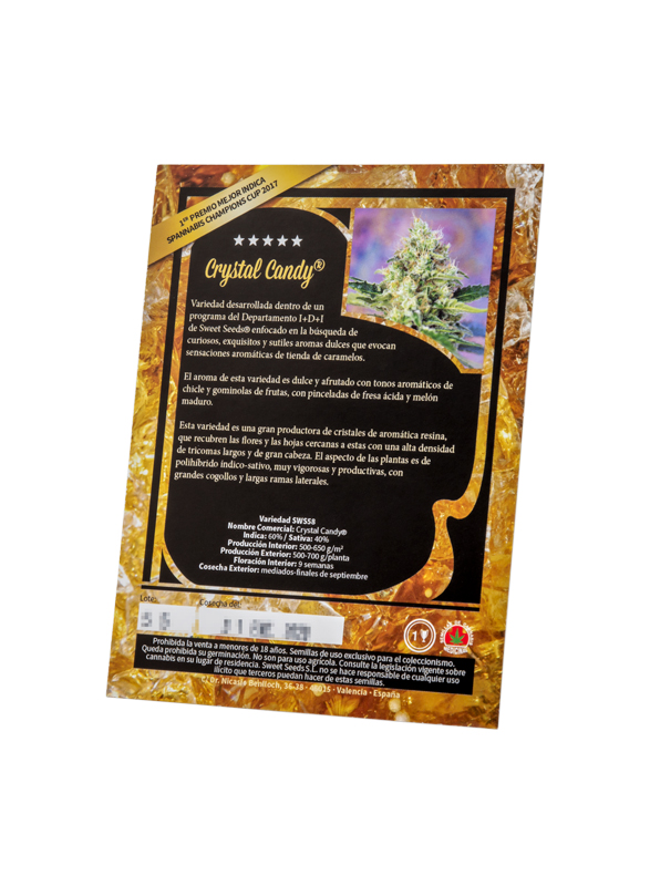 Las semillas de marihuana Crystal Candy de Sweet Seeds son una variedad de cannabis feminizada con dominancia Indica cuyo origen genético no ha sido desvelado. Se trata de una variedad creada con miras a conseguir una gran producción de resina.