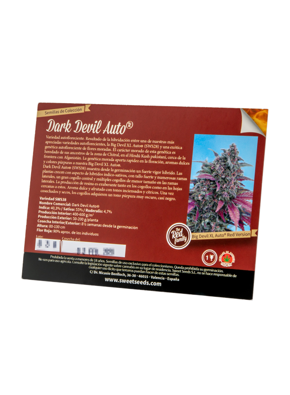 Las semillas de marihuana Dark Devil Auto de Sweet Seeds son una variedad de cannabis autoflorecientes que tiene su origen en el cruce de una Big Devil XL Auto y una exótica genética autofloreciente de flores moradas desarrollada en colaboración con el departamento I+D del banco de semillas feminizadas Buddha Seeds.