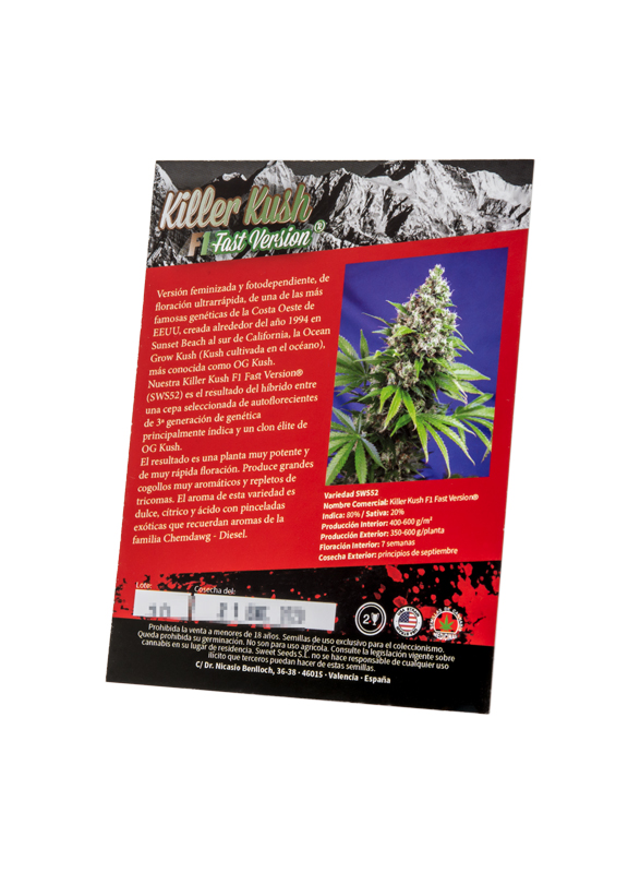 El aroma y el sabor de Killer Kush Fast Version son pronunciados, con notas a cítricos, a fruta dulce y a Diesel. Su efecto es potente, relajante y de larga duración. Se trata de una variedad ideal para pasar un agradable momento de descanso.