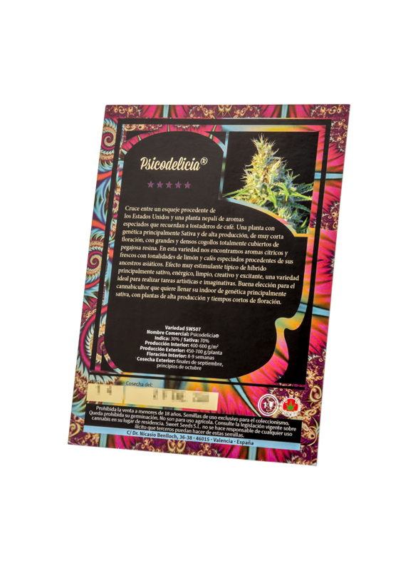 Psicodelicia tiene un intenso y dulce aroma muy diferente al resto de genéticas de Sweet Seeds: aromas cítricos y frescos con tonalidades de limón y cafés especiados procedentes de sus ancestros asiáticos. Aromas bien marcados pero suaves y delicados recordando a las buenas sativas de sabores y aromas sutiles y nada empalagosos. Su efecto es típico de híbrido principalmente sativo, enérgico, limpio y excitante, una variedad de marihuana ideal para realizar tareas artísticas e imaginativas.