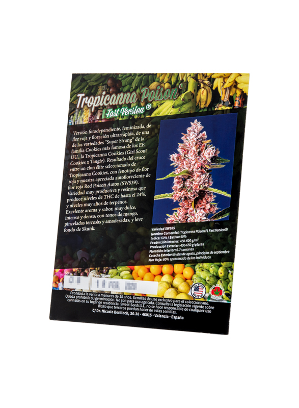 Tropicanna Poison F1 Fast Version presenta un eccezionale profilo terpenico che si traduce in una profonda intensità aromatica e gustativa, con note fruttate di mango e sfumature terrose, di legno e di Skunk. L'effetto, di tipo indica, è rilassante e calmante, ma attenzione perché un tiro di troppo e potrebbe stendere chiunque.